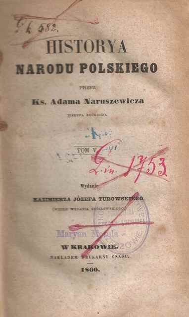 Historya narodu polskiego. T. 5[-6] / przez Adama Naruszewicza. - Kraków : Biblioteka Polska, 1860. - 2 t. w 1 vol. (XXX, V, [2], 8-298 s. ; XXII, 239, [1], 108, 50 s.) ; 20 cm.